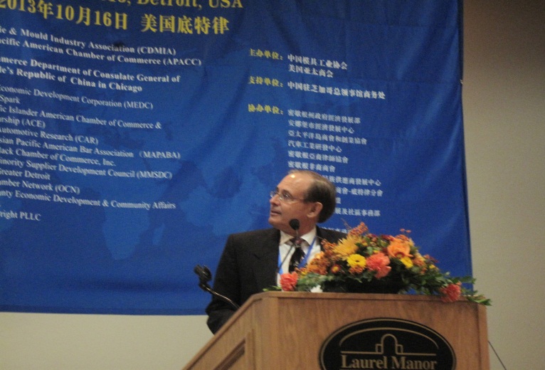 1,中國模具工業協會常務副會長兼秘書長武兵書做了“中國模具的現狀和發展前景”的報告。武兵書秘書長首先代表中國模協感謝本次活動的合作者和密歇根州政府經濟發展署簽發的邀請函,正是他們的積極努力和熱情支持,使得本次活動的中國代表團全部順利取得簽證并按計劃出席這次活動。隨后他介紹了中國模具工業概況,重點談了中國模具工業近30年的發展:建立了較完整的模具工業體系、模具產能及進出口增長迅速、中美模具(技術)貿易歷史悠久并發展勢頭強勁等。他在講演時還分析了中國模具市場,特別是汽車模具市場發展情況,歡迎美國三大汽車更多參與中國汽車模具技術和產品的交流和貿易。他還介紹了參加本次活動的中國模具企業。