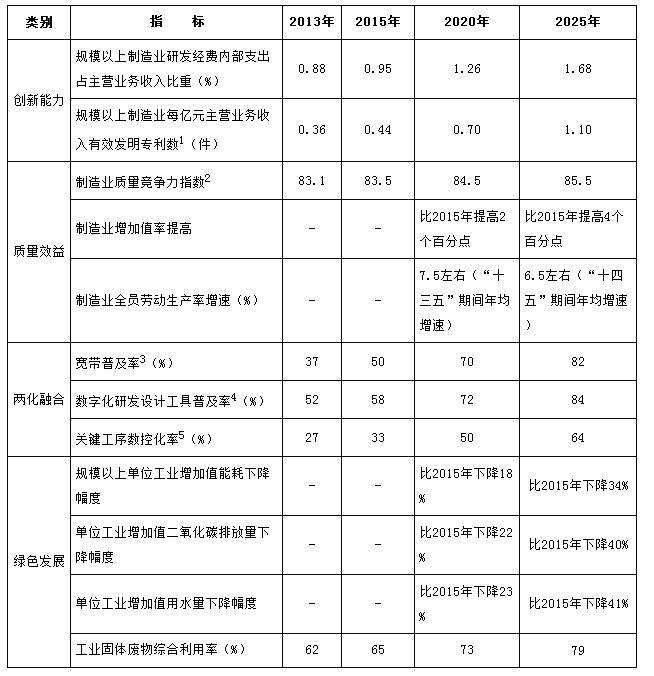到2025年,制造業整體素質大幅提升,創新能力顯著增強,全員勞動生產率明顯提高,兩化(工業化和信息化)融合邁上新臺階。重點行業單位工業增加值能耗、物耗及污染物排放達到世界先進水平。形成一批具有較強國際競爭力的跨國公司和產業集群,在全球產業分工和價值鏈中的地位明顯提升。