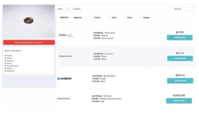 3D Printler 總共列出了172種打印方案,上圖中截取了其中4種不同材料的打印方案, PLA、瓷土、銀和18K金,價格從12.9美元到16872.8美元不等。