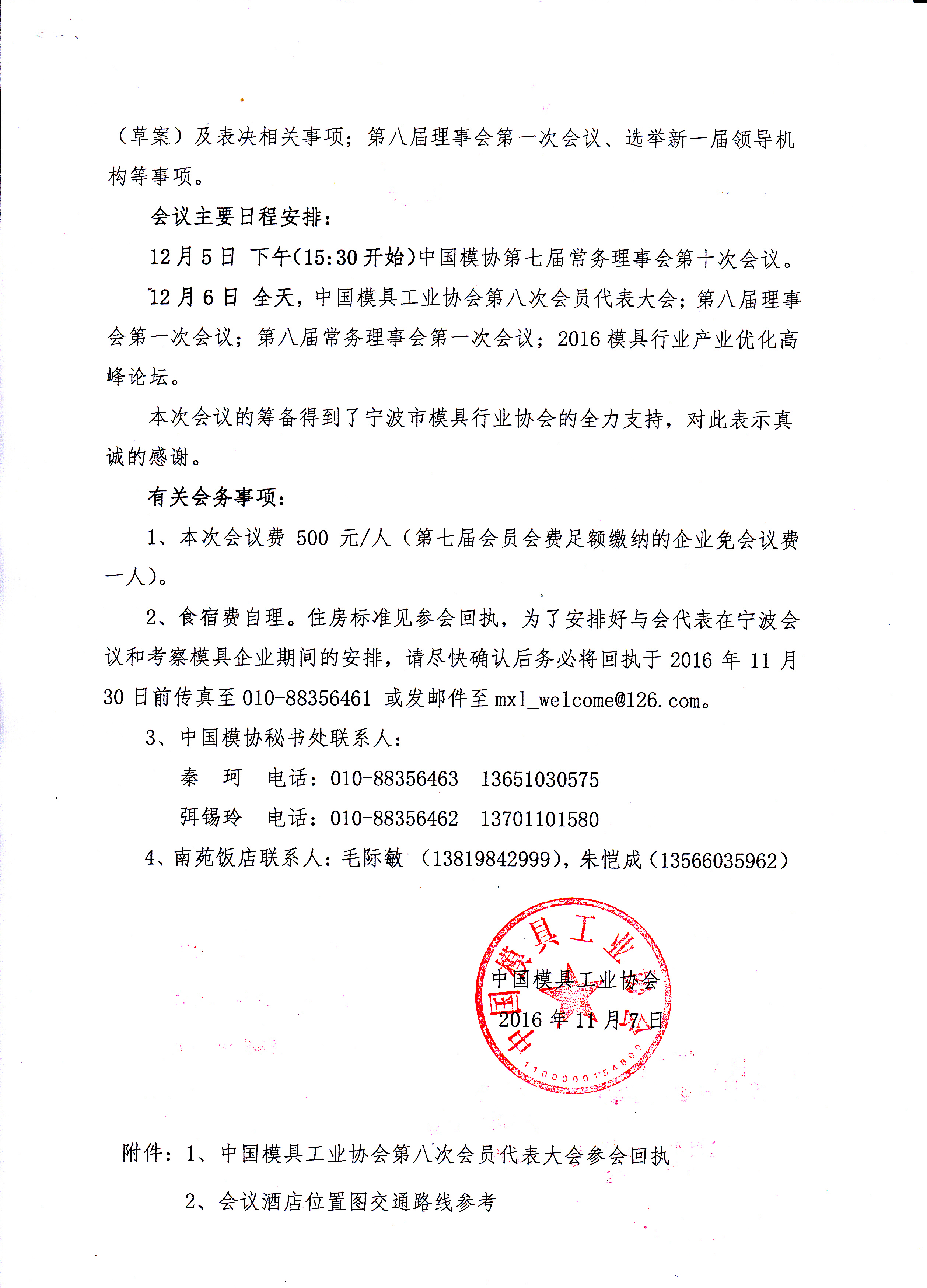 關于召開中國模具工業協會第八次會員代表大會第八屆理事會第一次會議 第八屆常務理事會第一次會議暨2016模具行業產業優化高峰論壇的通知 |