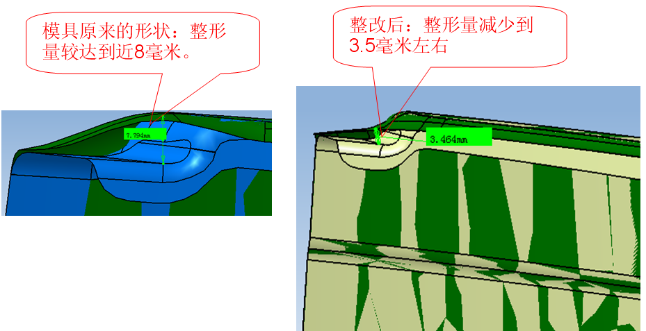 原工藝采用拉延出一部分形狀后序整形的方法,整形量較大達到近8mm。在保證B處在拉延不開裂的情況下,此臺階盡量拉延到位,使整形量相對減少到3.5mm左右,整形時疊料缺陷消除。整改前后數模對比如下圖: