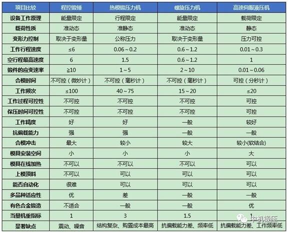 二、幾種熱鍛成形設備工藝參數(shù)及性能比較