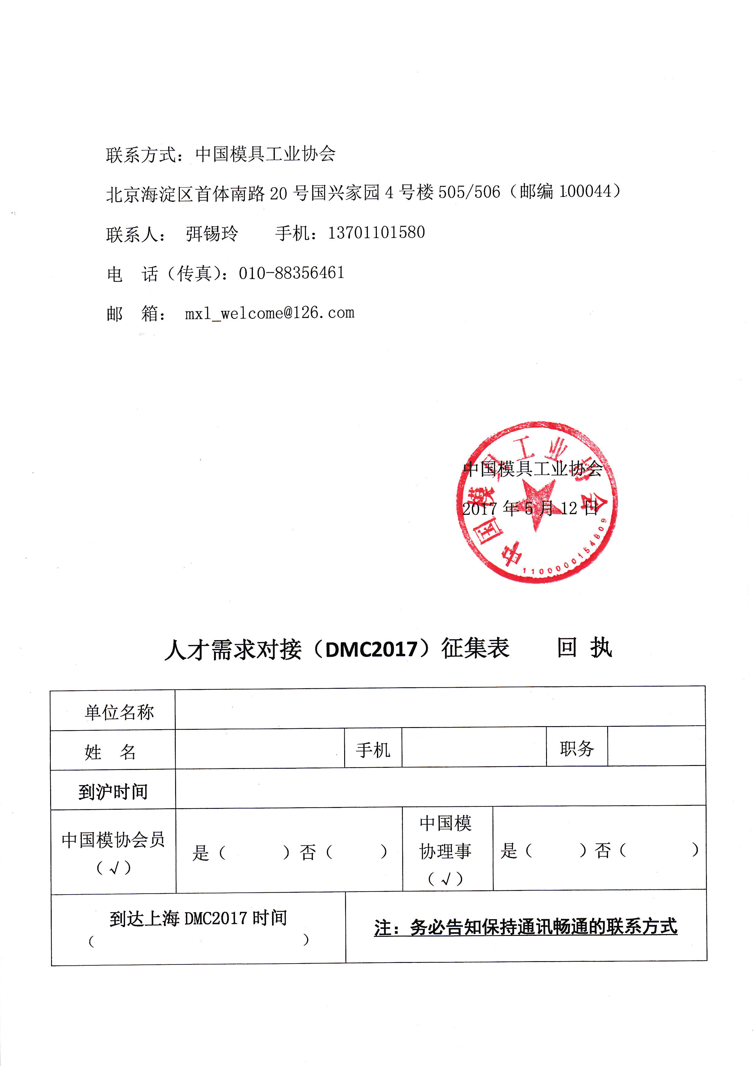 邀請參加高端模具企業與重點職業院校DMC2017期間對接簽約活動的函