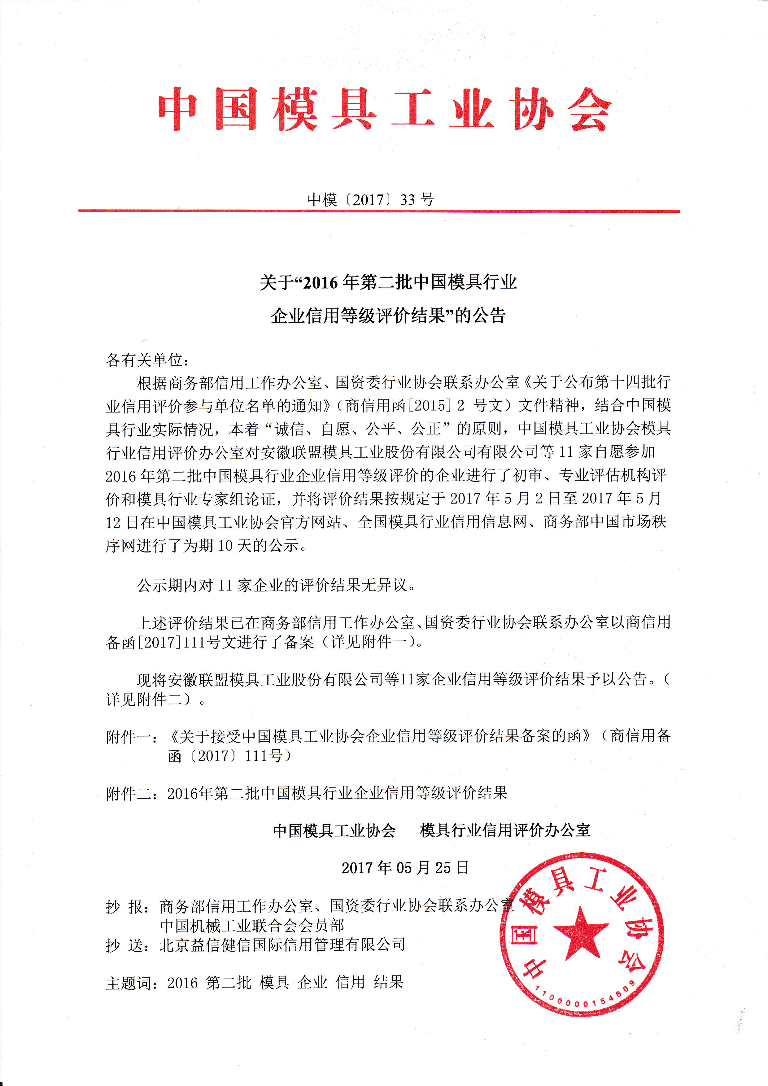 關(guān)于“2016年第二批中國模具行業(yè)企業(yè)信用等級評價結(jié)果”的公告