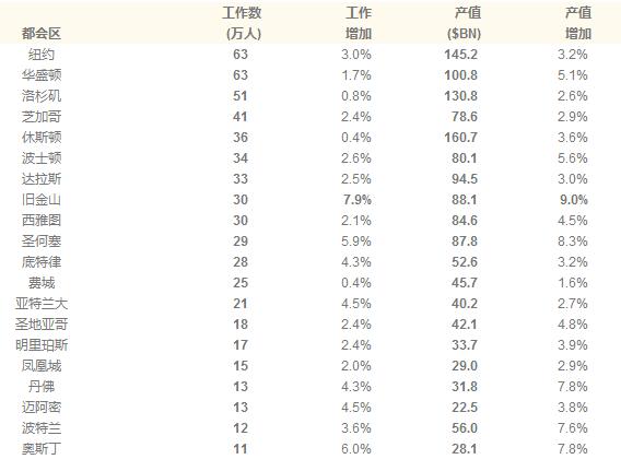 最大的20個先進產業都會地區的數據和排名如下。工作數、產值來自2015年的數據,增加值是指2013年到2015年的增加。