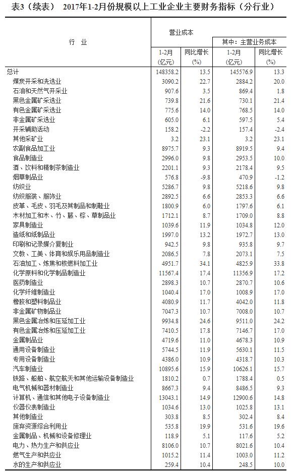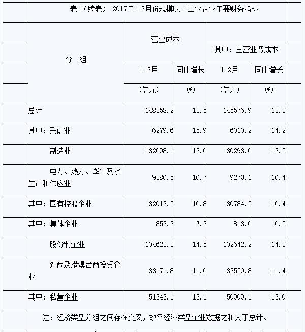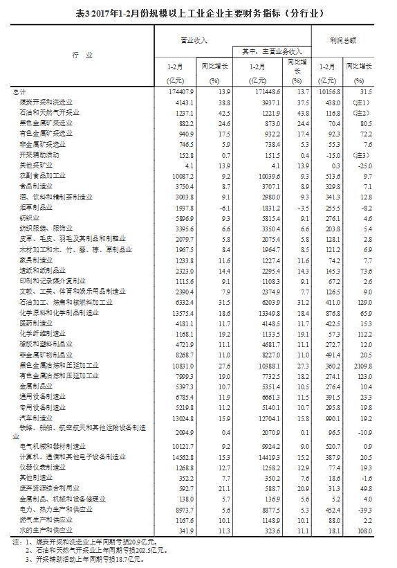表1 2017年1-2月份規(guī)模以上工業(yè)企業(yè)主要財務(wù)指標(biāo)