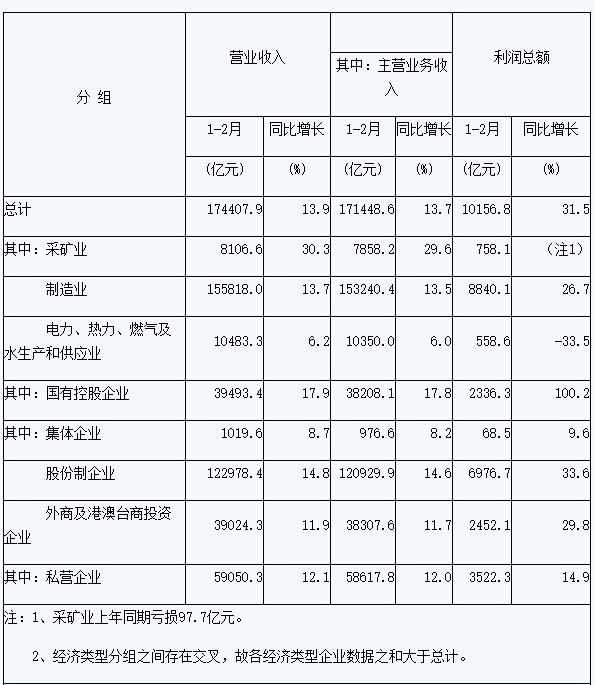 1-2月份,規(guī)模以上工業(yè)企業(yè)中,國有控股企業(yè)實(shí)現(xiàn)利潤總額2336.3億元,同比增長1倍;集體企業(yè)實(shí)現(xiàn)利潤總額68.5億元,增長9.6%;股份制企業(yè)實(shí)現(xiàn)利潤總額6976.7億元,增長33.6%;外商及港澳臺商投資企業(yè)實(shí)現(xiàn)利潤總額2452.1億元,增長29.8%;私營企業(yè)實(shí)現(xiàn)利潤總額3522.3億元,增長14.9%。