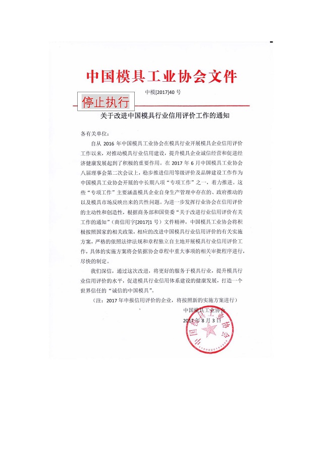 關于改進中國模具行業信用評價工作的通知