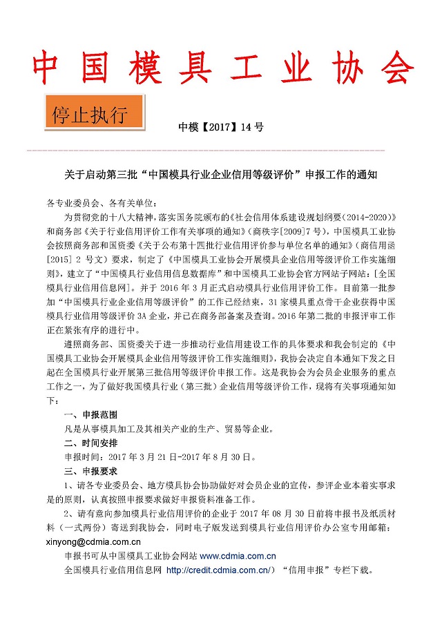關于啟動第三批“中國模具行業企業信用等級評價”申報工作的通知