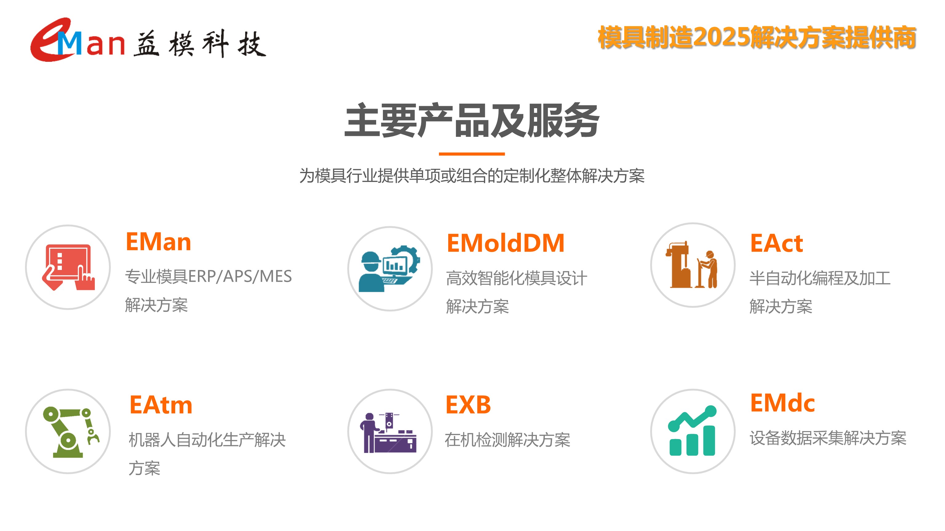 公司目前主要產(chǎn)品包括EMan 專(zhuān)業(yè)模具ERP/APS/MES;EMoldDM 高效智能化模具設(shè)計(jì)整體解決方案;EAct 模具/刀輔具半自動(dòng)化加工解決方案;EAtm CNC/CMM/EDM全自動(dòng)化加工單元解決方案;EXB在機(jī)檢測(cè)解決方案等產(chǎn)品及其技術(shù)服務(wù),產(chǎn)品應(yīng)用覆蓋汽車(chē)、家電、電子、手機(jī)/數(shù)碼、金屬制品、建材等各個(gè)行業(yè)領(lǐng)域,客戶(hù)遍布全國(guó)17個(gè)省市乃至德國(guó)、越南等海外區(qū)域。