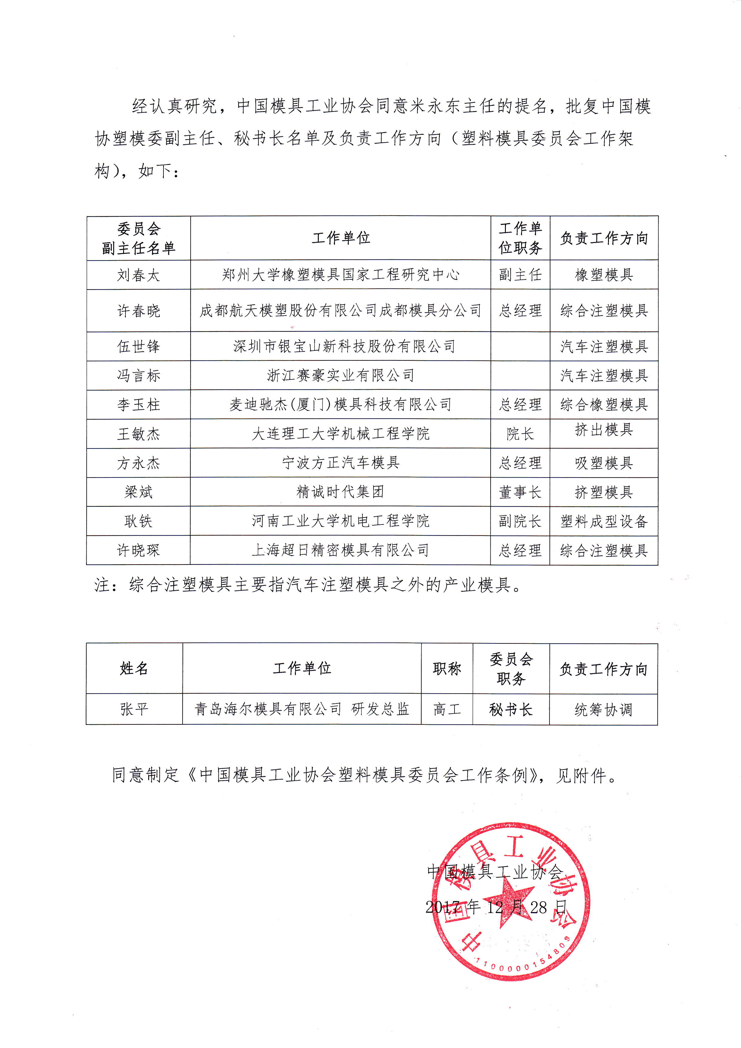 中國模具工業協會八屆理事會塑料模具委員會建制的批復