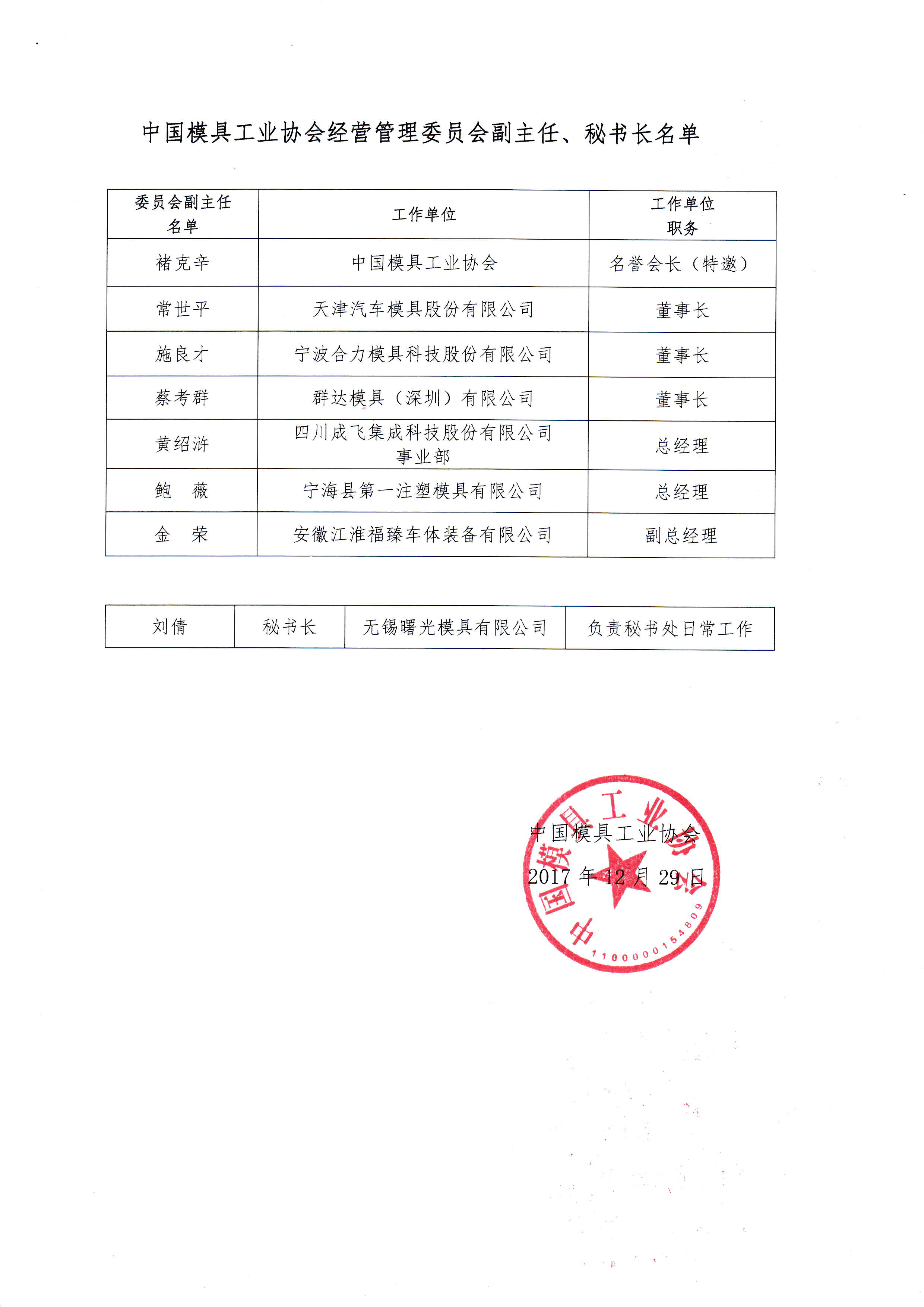 中國模具工業協會八屆理事會經營管理委員會建制的批復