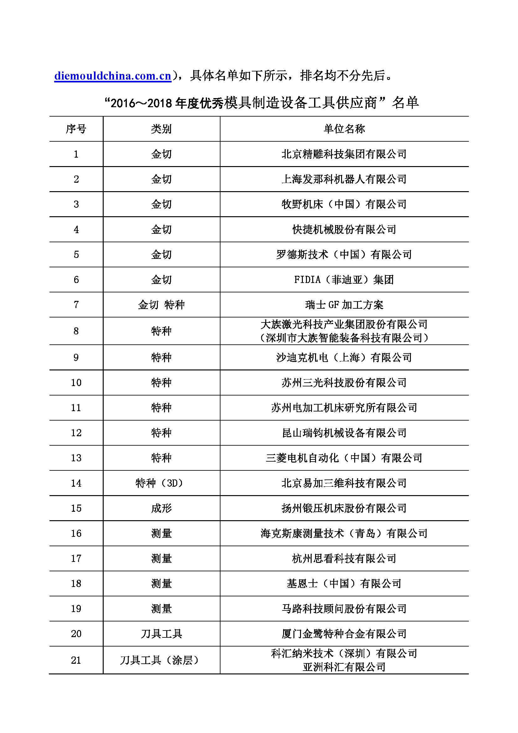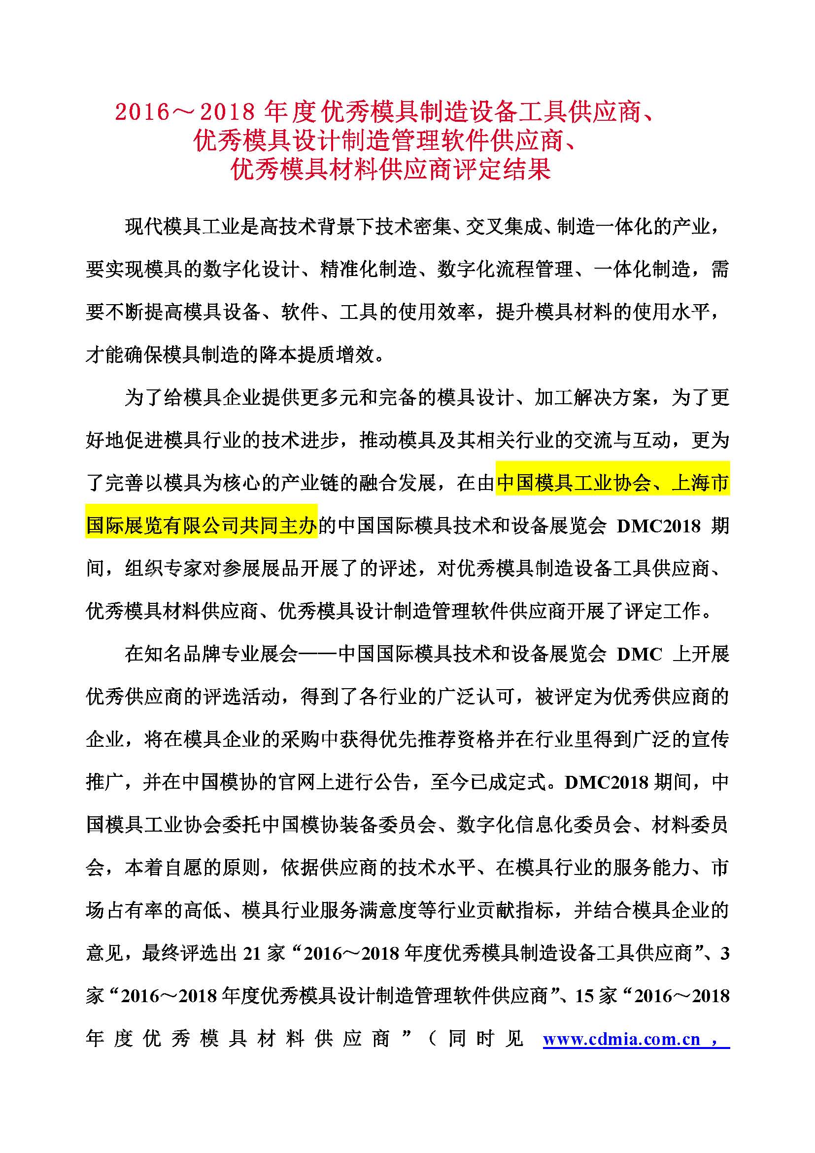 2016~2018年度優(yōu)秀模具制造設(shè)備工具供應(yīng)商、 優(yōu)秀模具設(shè)計(jì)制造管理軟件供應(yīng)商、 優(yōu)秀模具材料供應(yīng)商評(píng)定結(jié)果