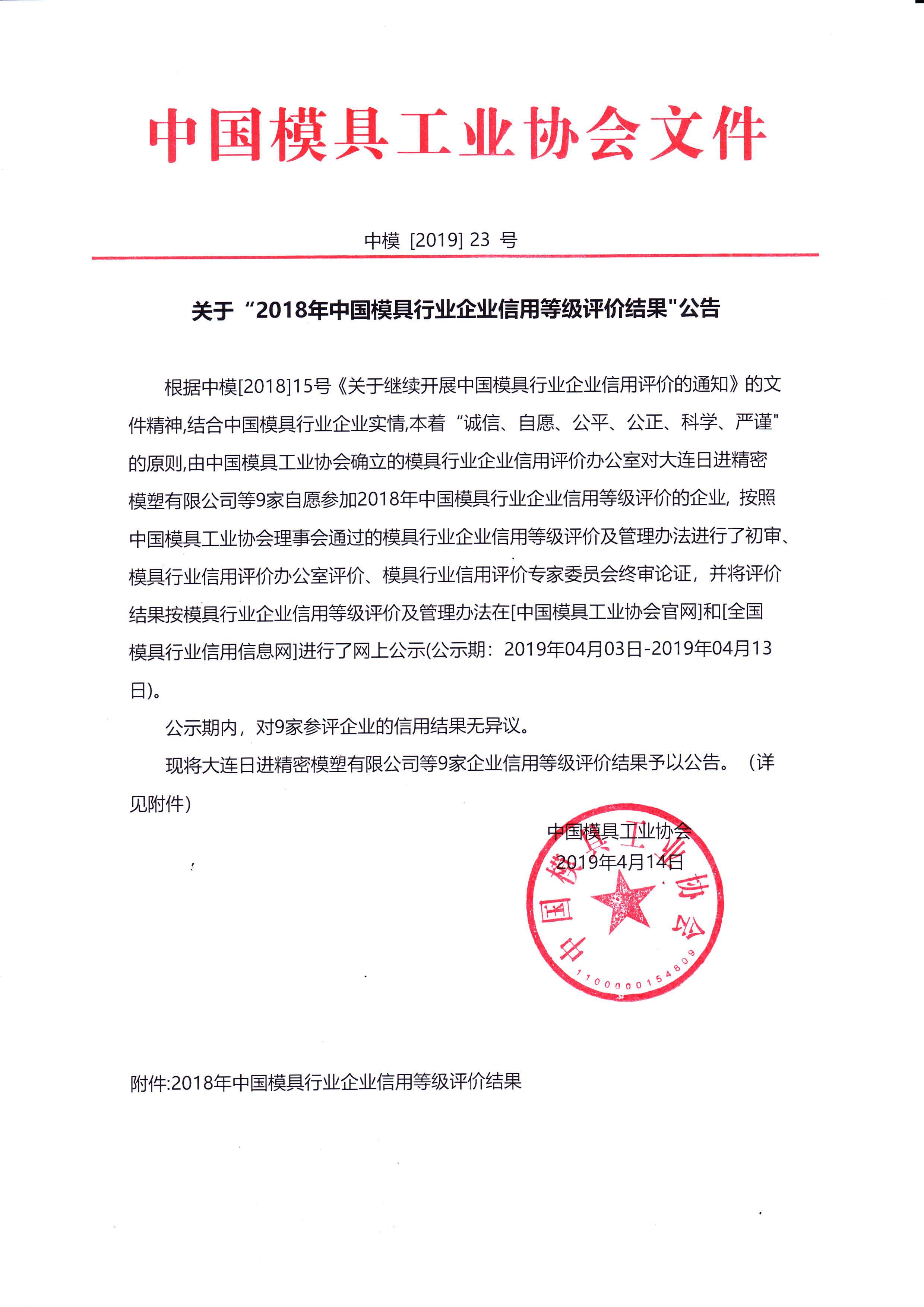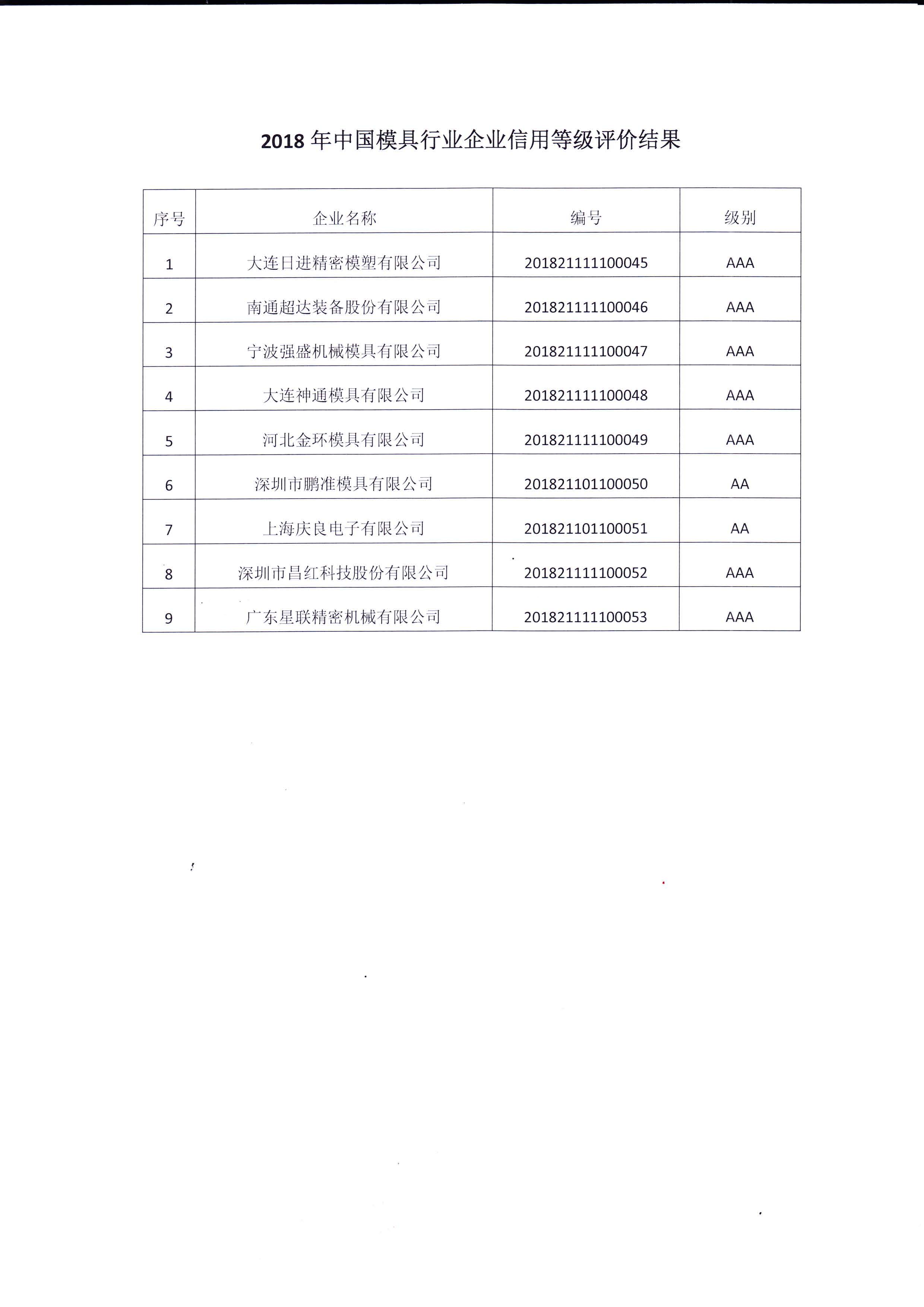 關于“2018年中國模具行業企業信用等級評價結果”公告