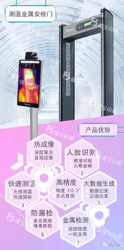 在疫情得到控制,經濟引擎加速,返工、返校大潮到來之際,如何配合政府和企業做好復工、復課人員健康狀態的監控,快捷準確識別體溫,形成一人一檔的健康檔案,為社會提供更穩妥的健康安全保障?銀寶山新迅速整合集團旗下子公司“美恩信息”的信息化開發技術,“白狐設計”的工業設計能力,在最短的時間內針對疫情需求精準開發研制了以熱成像技術和云端大數據為基礎的智慧測溫門并充分利用自身雄厚的制造實力,以最快的速度投放市場,為廣大復工企業、學校、機關單位提供了無需等待、防漏檢、精準測溫、軌跡可溯的健康監測智慧解決方案。