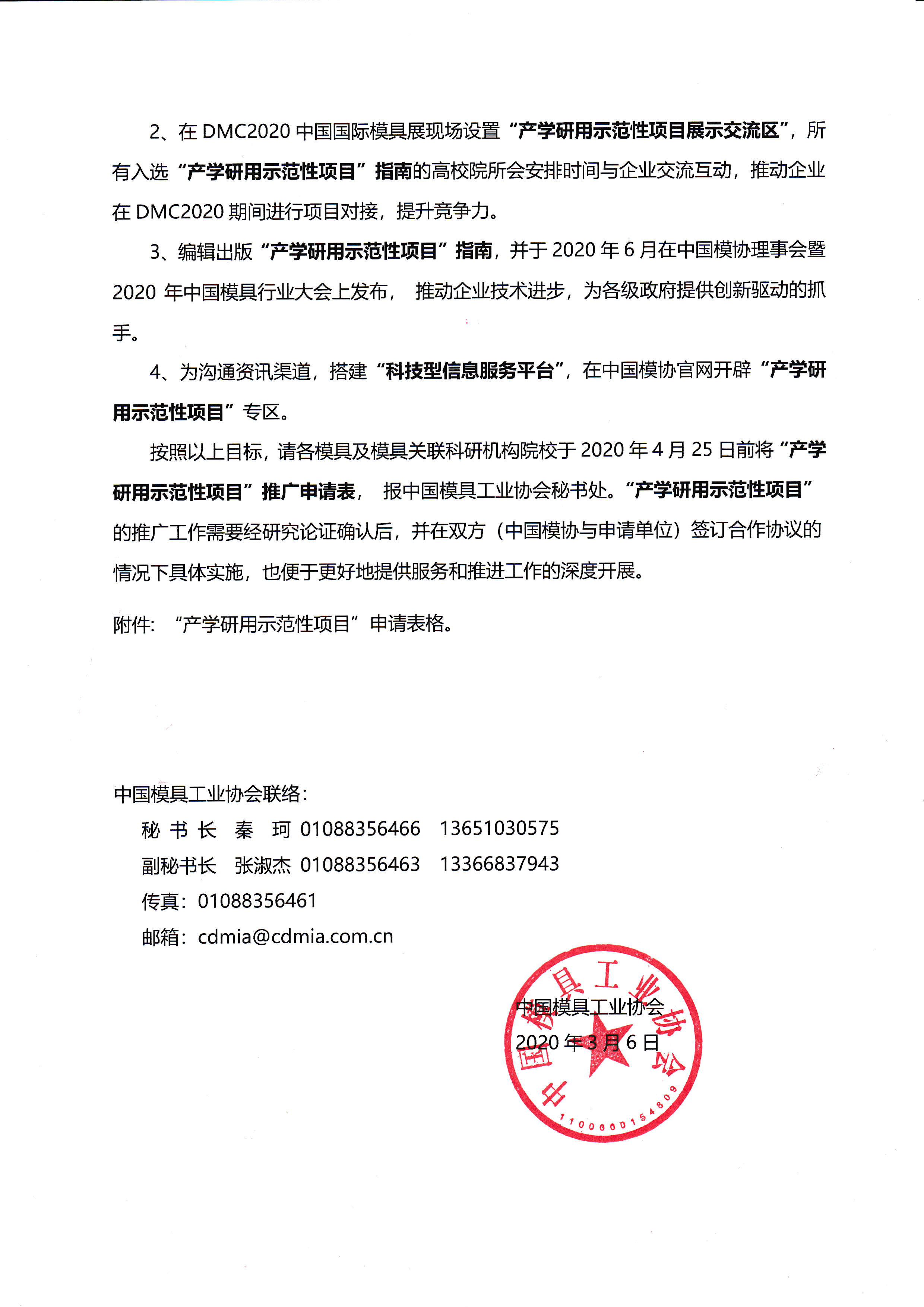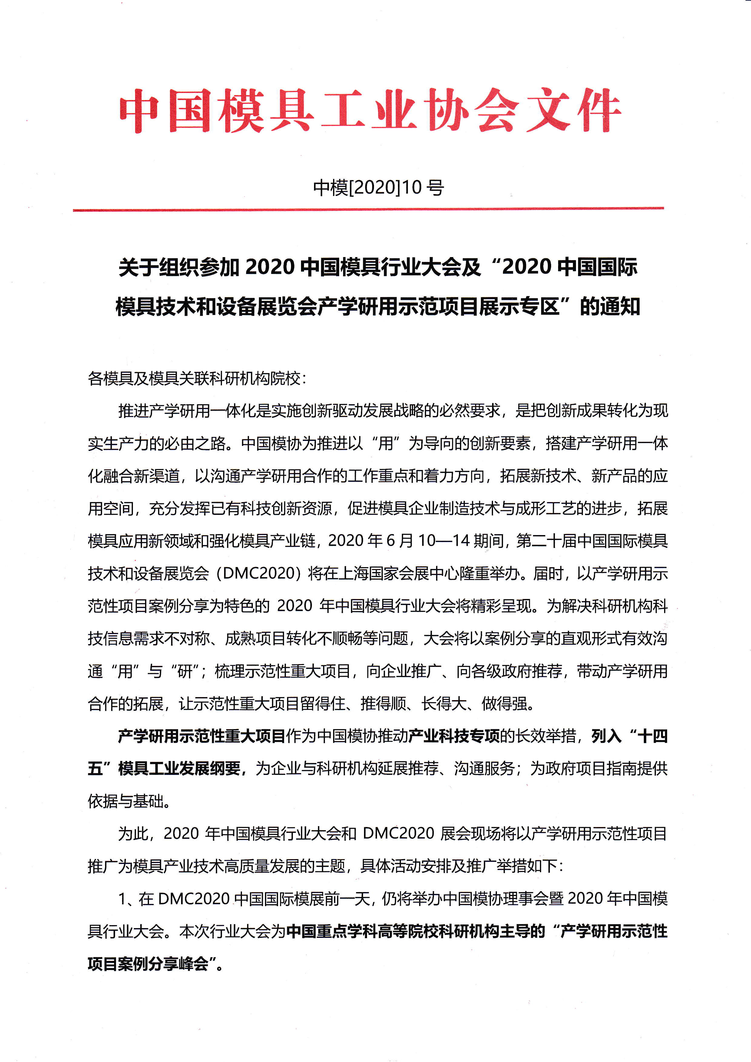 關(guān)于組織參加2020中國模具行業(yè)大會及“2020中國國際模具技術(shù)和設(shè)備展覽會產(chǎn)學(xué)研用示范項目展示專區(qū)”的通知