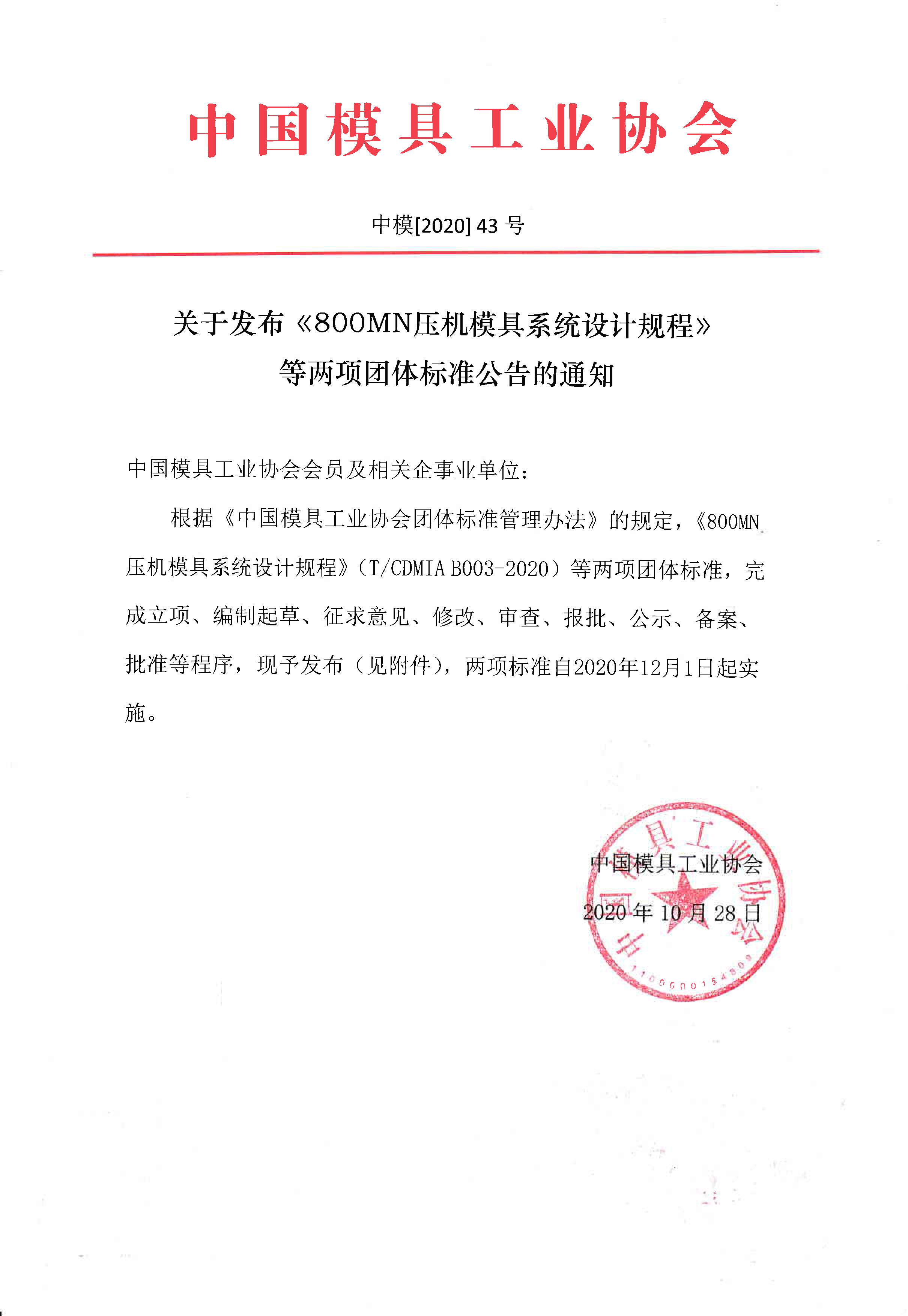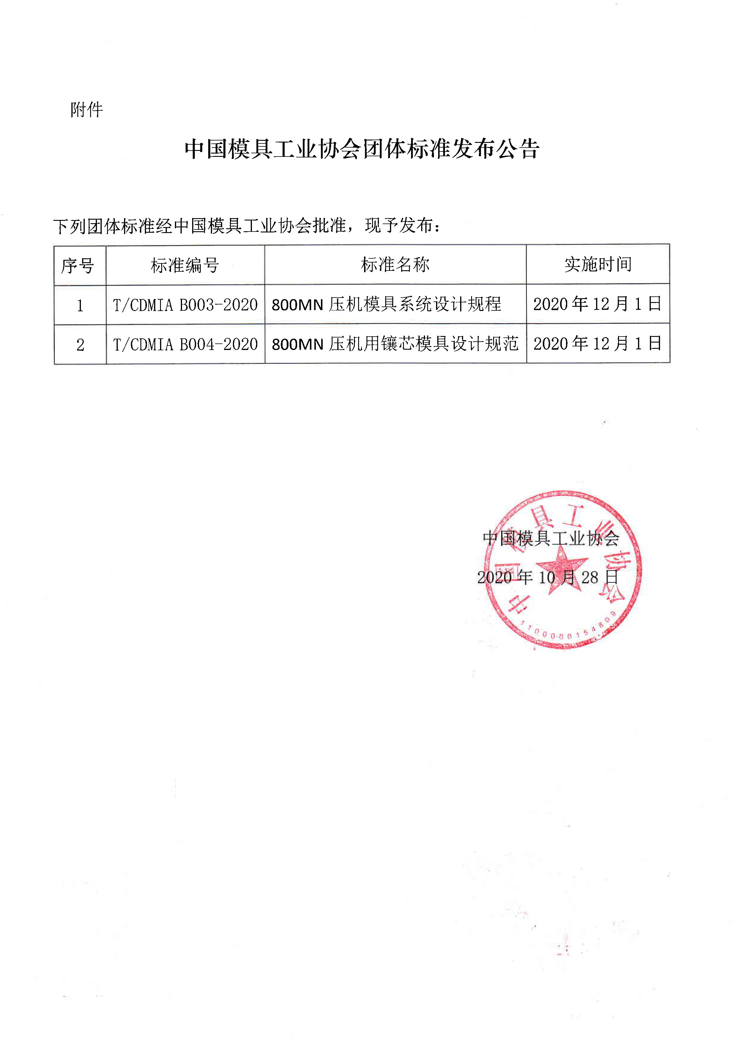 關于發布《800MN壓機模具系統設計規程》等兩項團體標準公告的通知