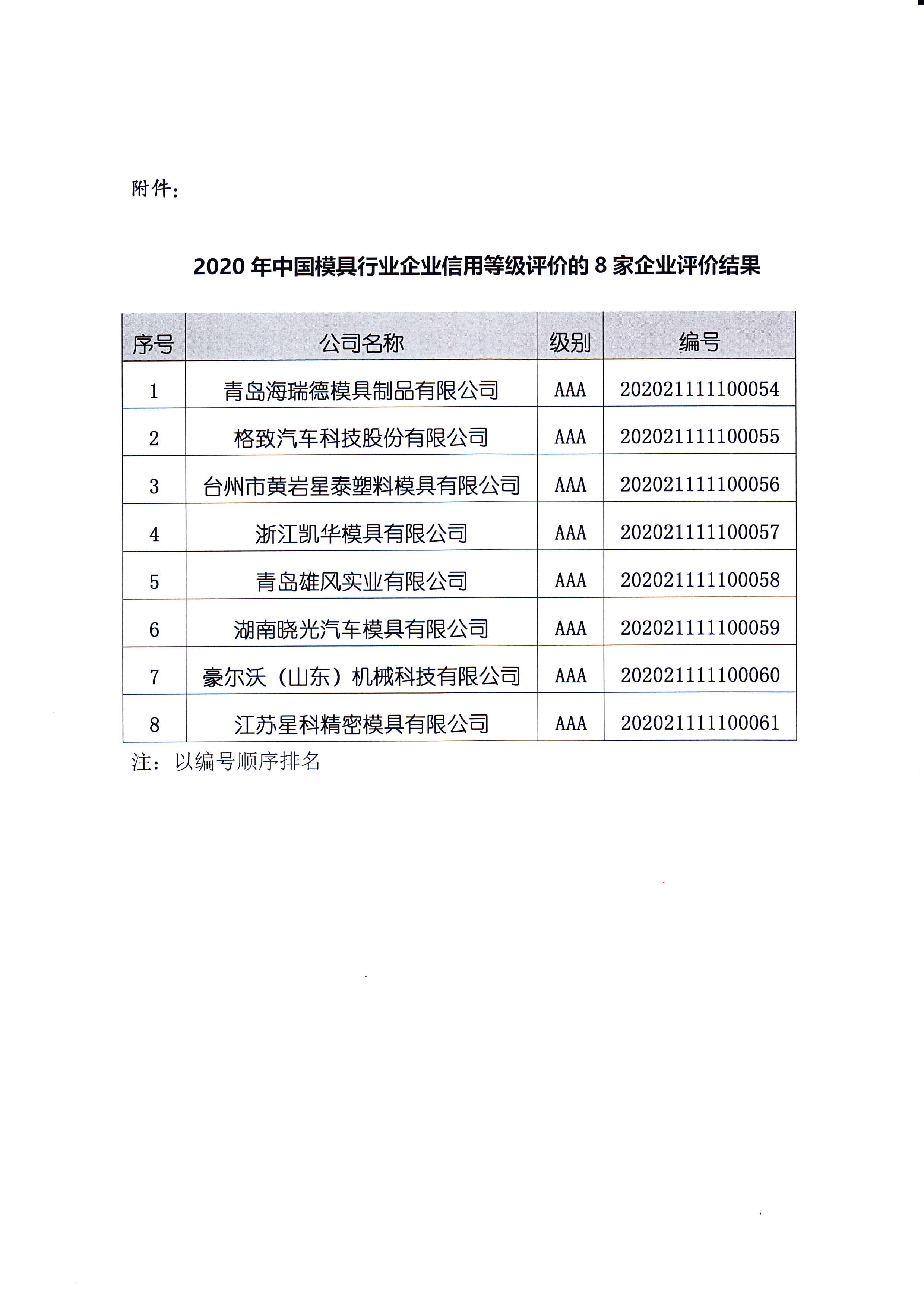 關(guān)于“2020年中國模具行業(yè)企業(yè)信用等級(jí)評(píng)價(jià)結(jié)果”的公告