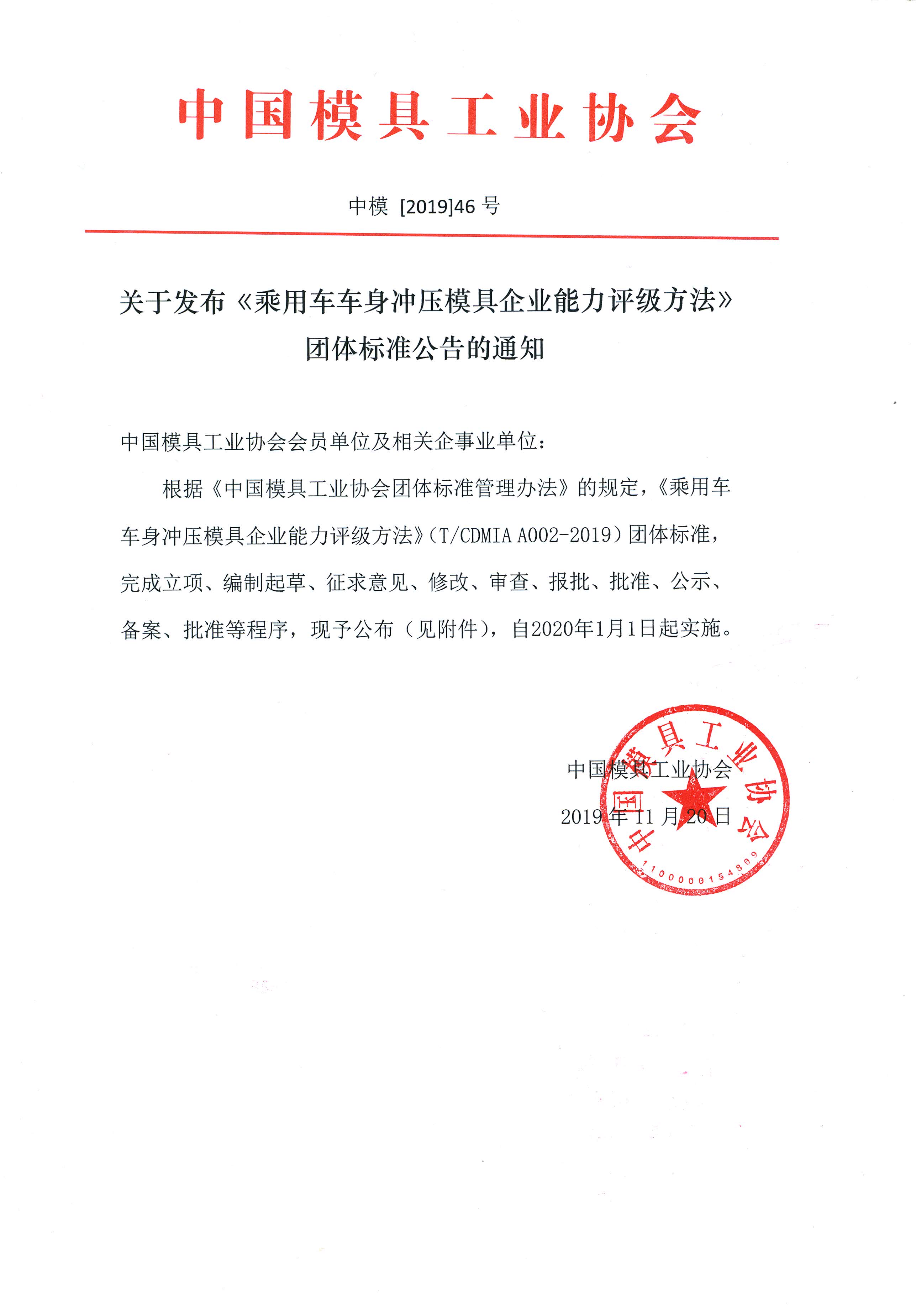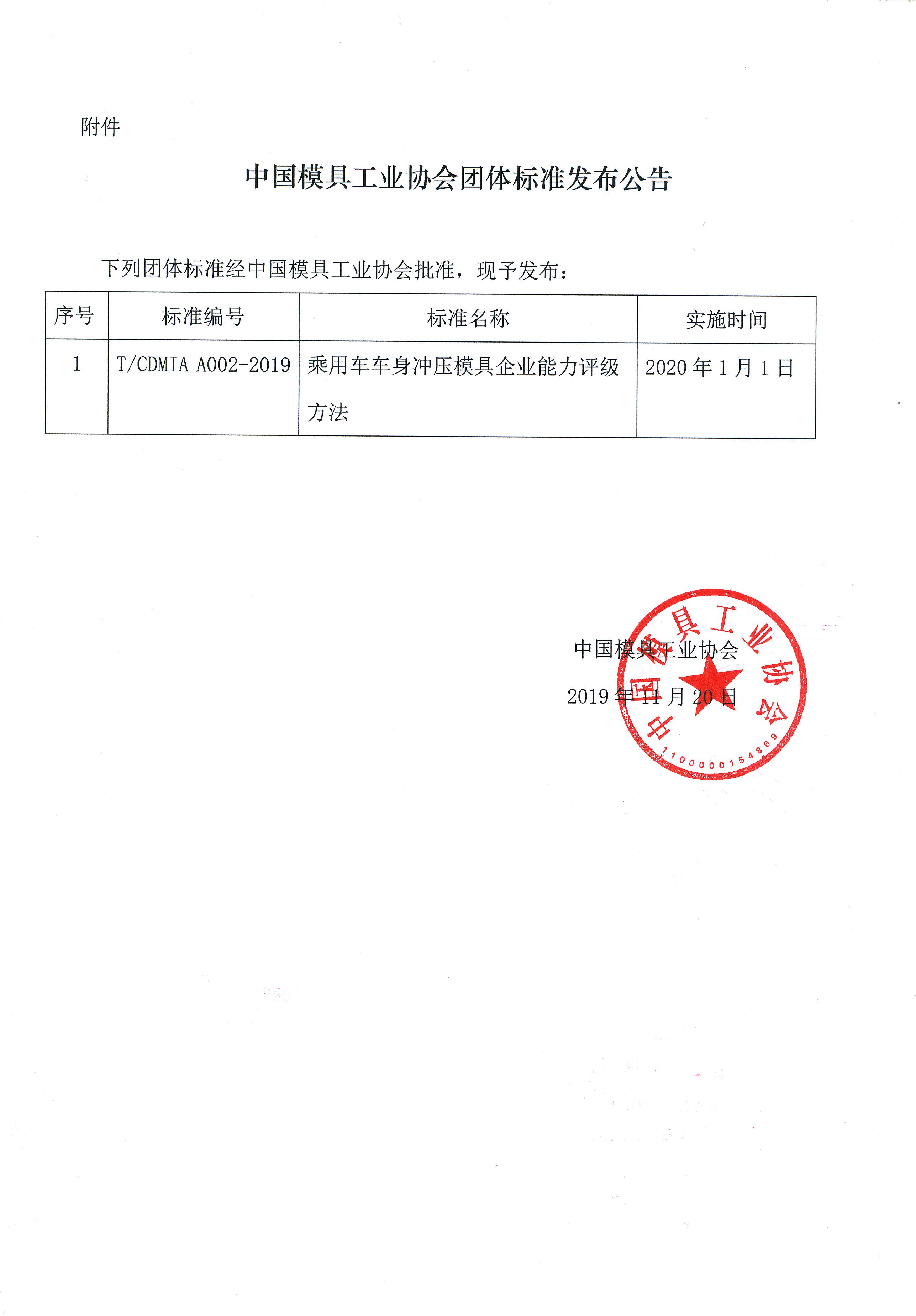 關于發布《乘用車車身沖壓模具企業能力評級方法》團體標準公告的通知