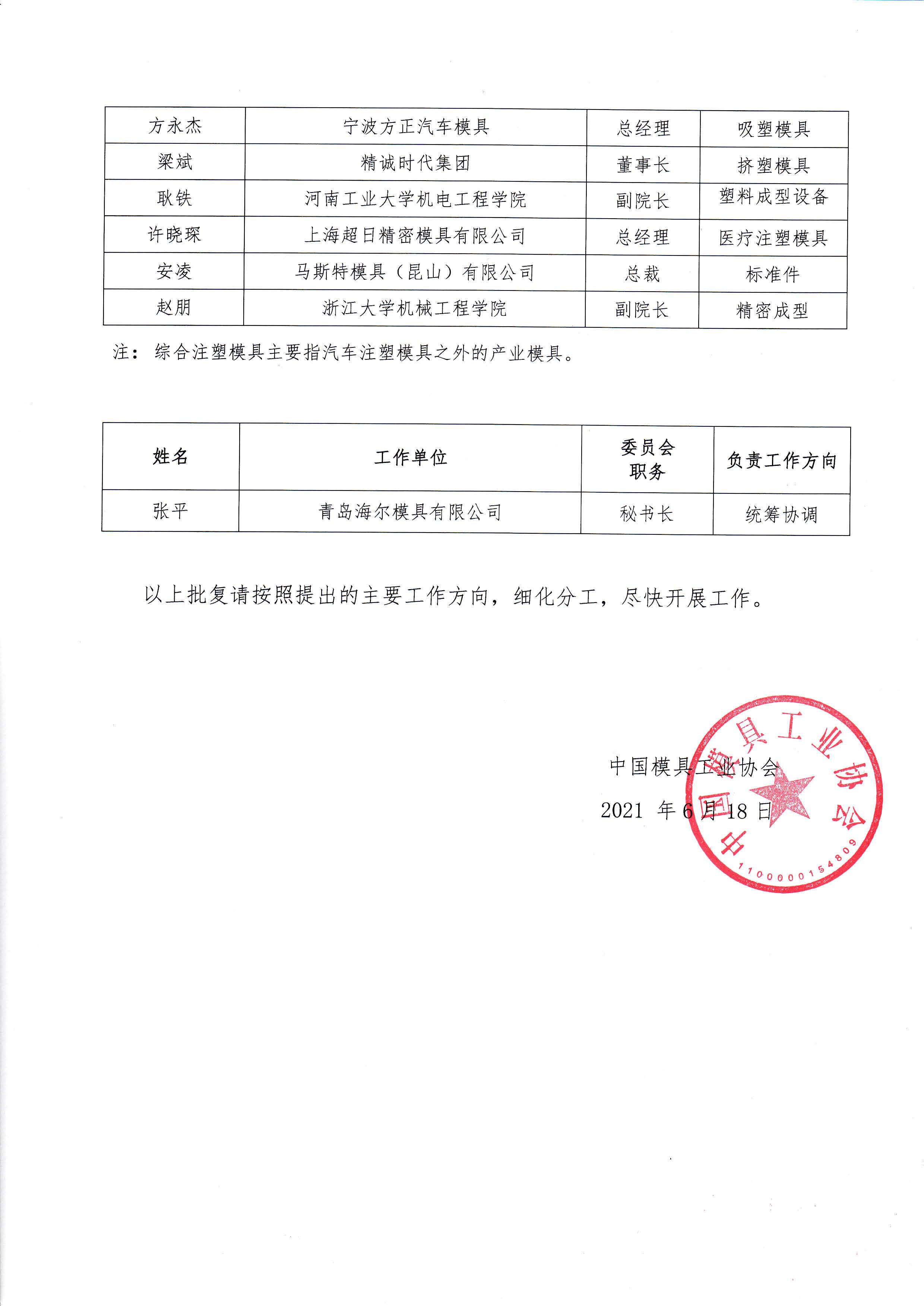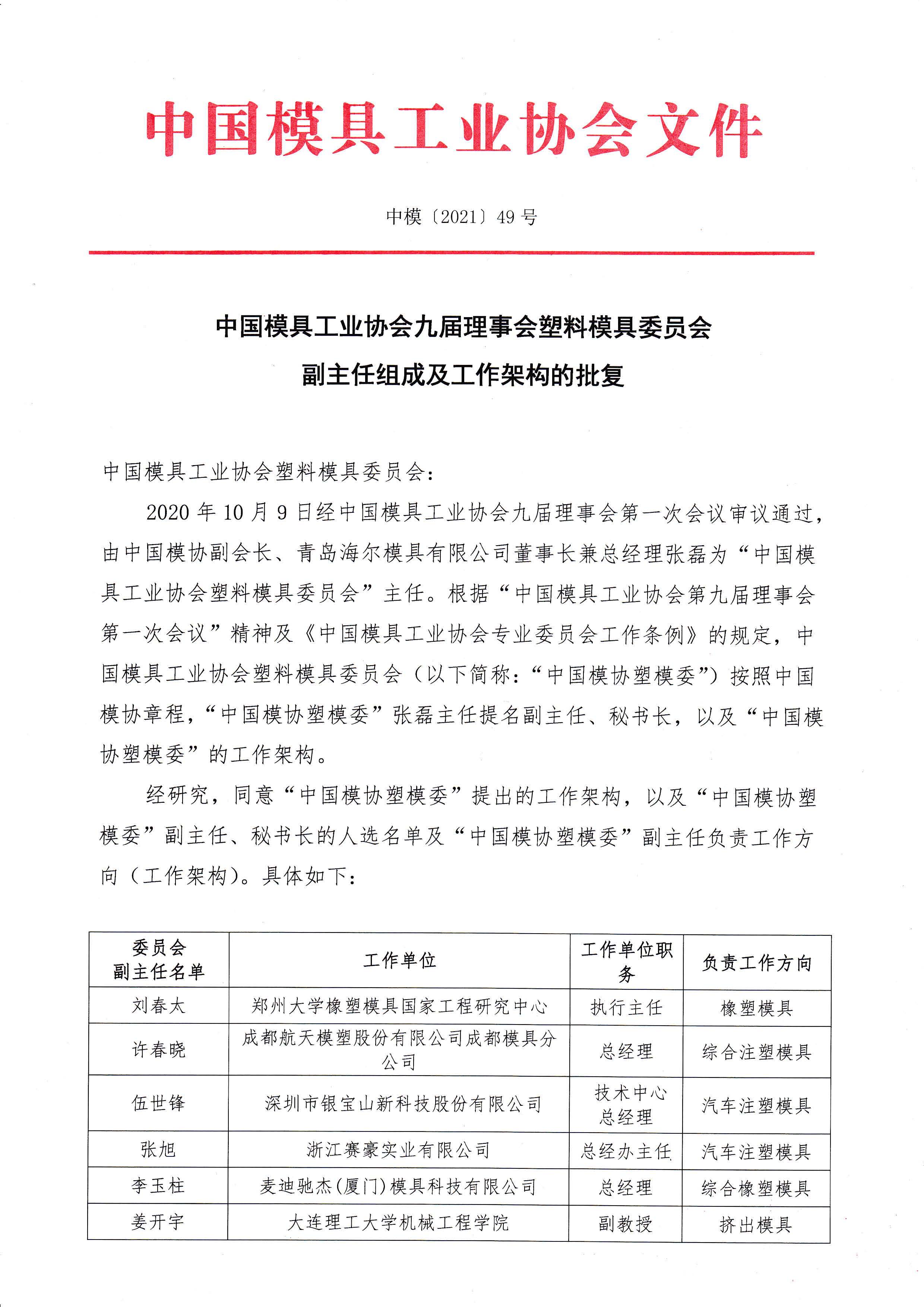 中國模協九屆理事會塑料模具委員會副主任組成及工作架構的批復