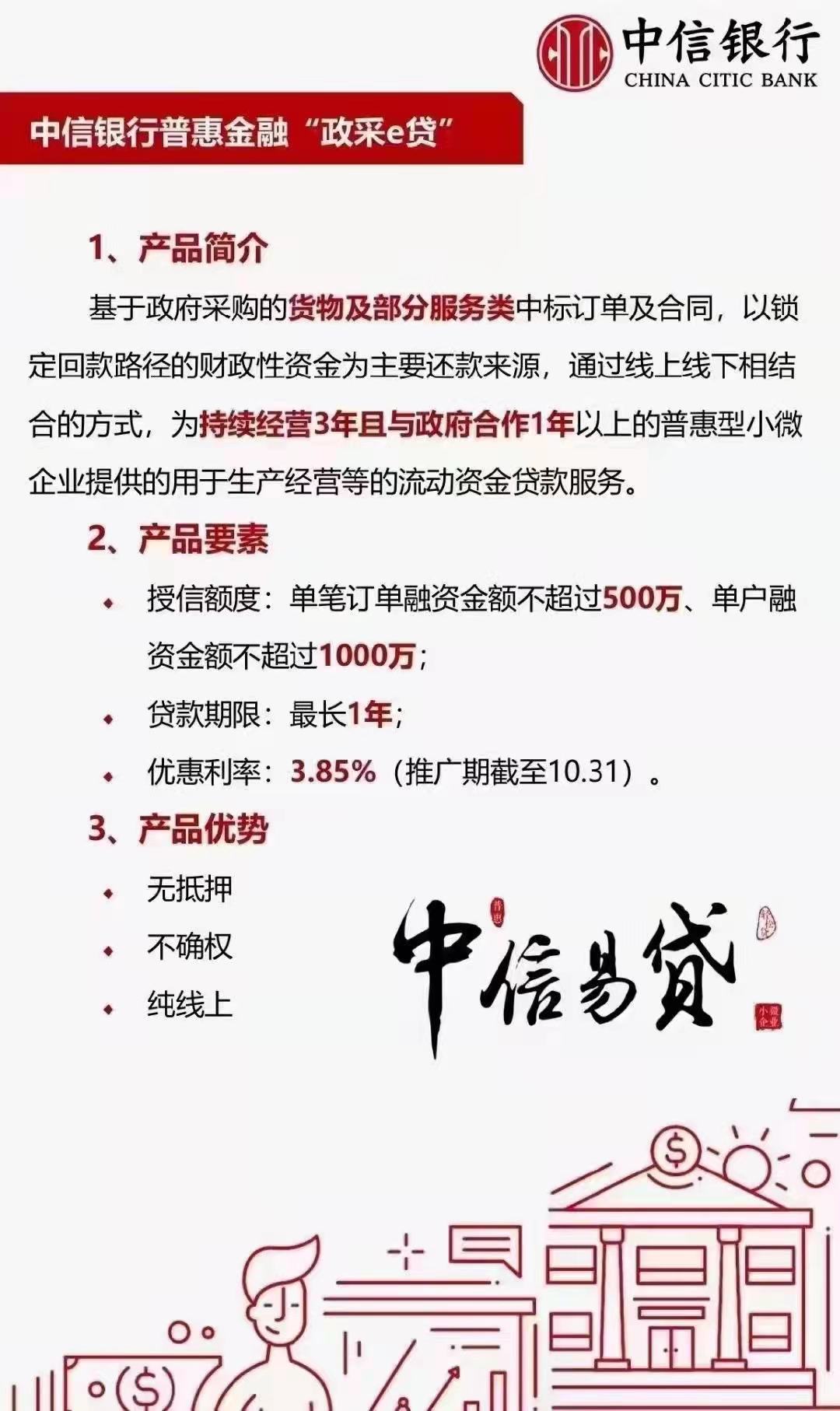 核心提示:中信銀行創新推出“政采e貸”產品,著力幫助解決部分小微企業在中標政府采購訂單后,因信息不對稱等原因導致的“融資難”問題,助力實體經濟復蘇。