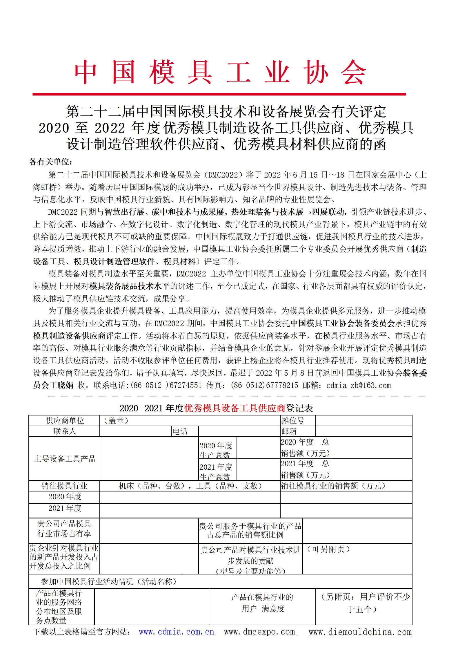 第二十二屆中國國際模具技術(shù)和設(shè)備展覽會有關(guān)評定 2020至2022年度優(yōu)秀模具制造設(shè)備工具供應(yīng)商、優(yōu)秀模具設(shè)計制造管理軟件供應(yīng)商、優(yōu)秀模具材料供應(yīng)商的函 |
