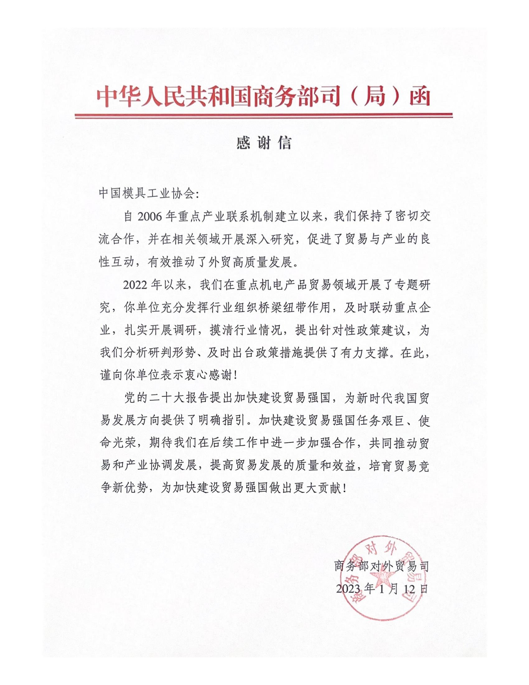 商務部對外貿(mào)易司致中國模協(xié)感謝信