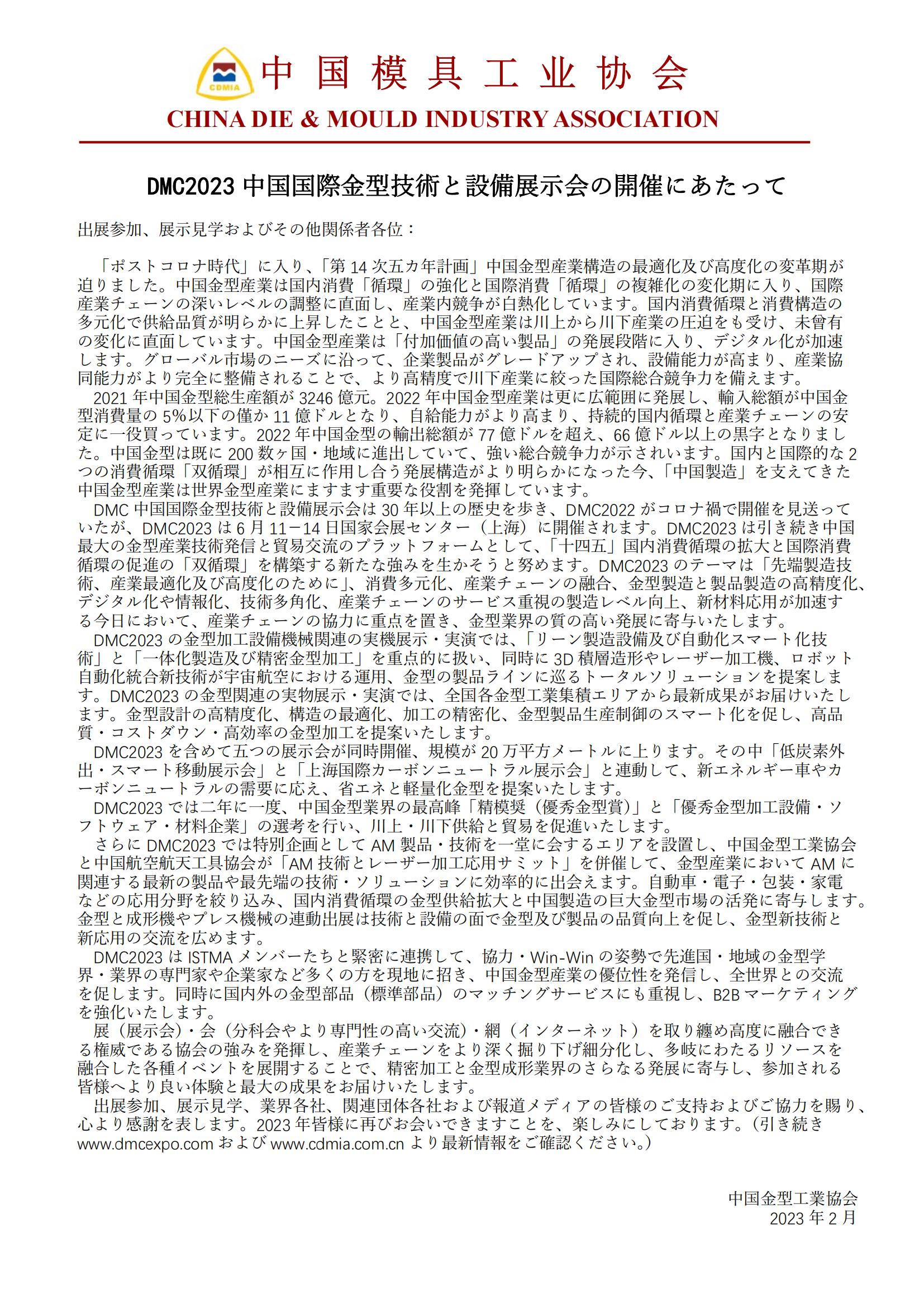 DMC2023 中國國際金型技術と設備展示會の開催にあたって