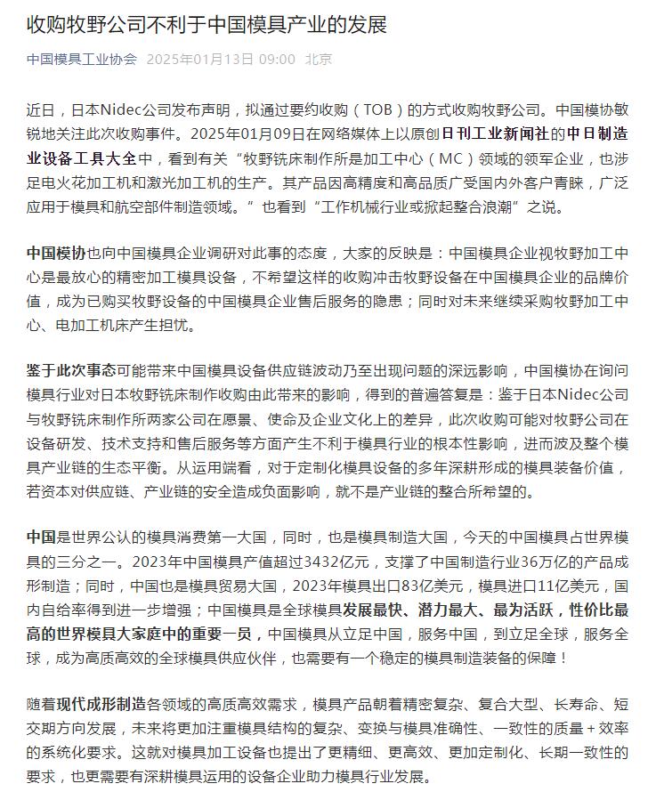 收購牧野公司不利于中國模具產業的發展